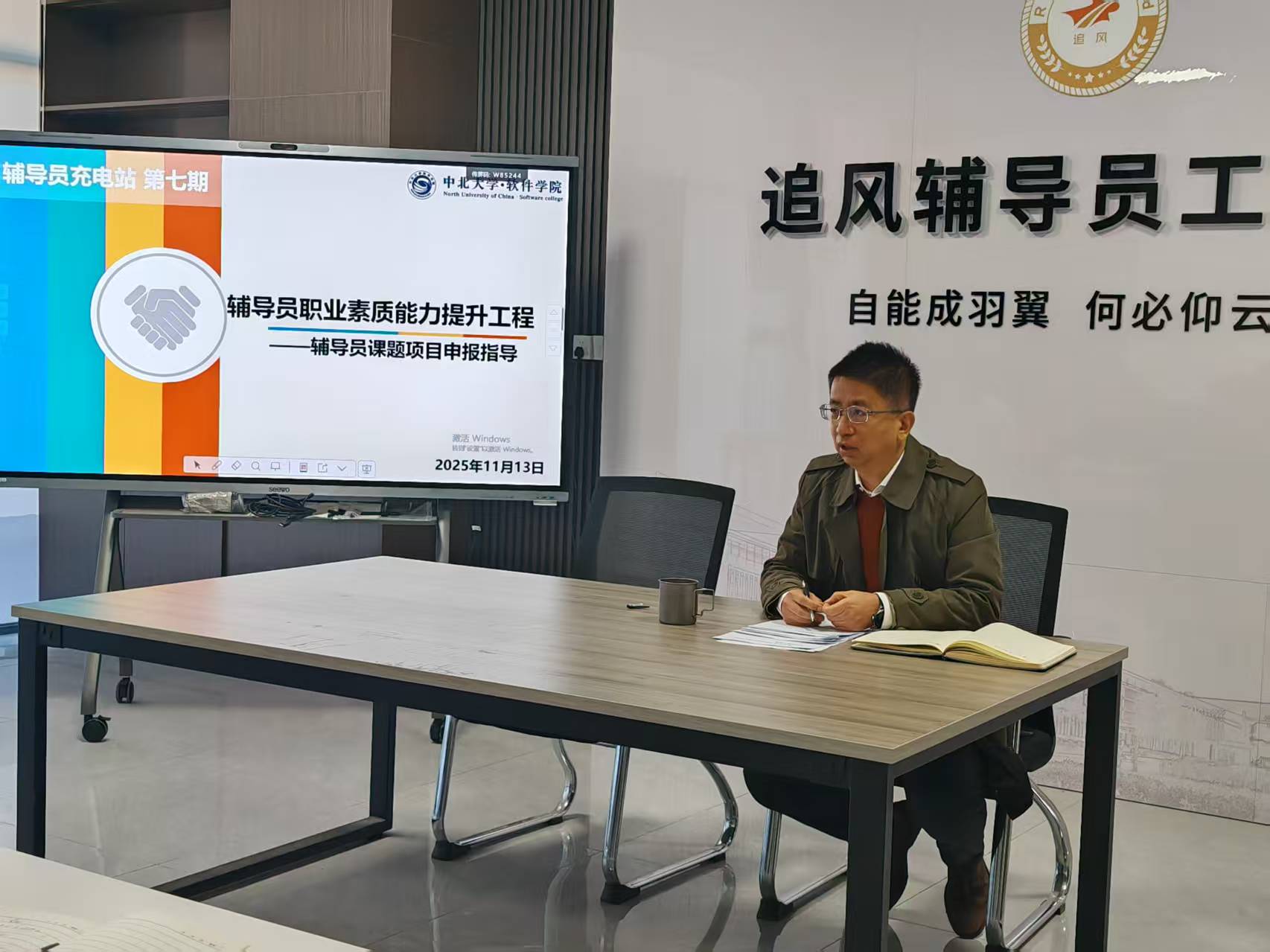 在“追风逐梦”辅导员工作室举办第七期“辅导员充电站”,本期主题是辅导员课题项目申报指导。学院院长强彦教授担任主讲人,学院党委副书记高宏图主持讲座。