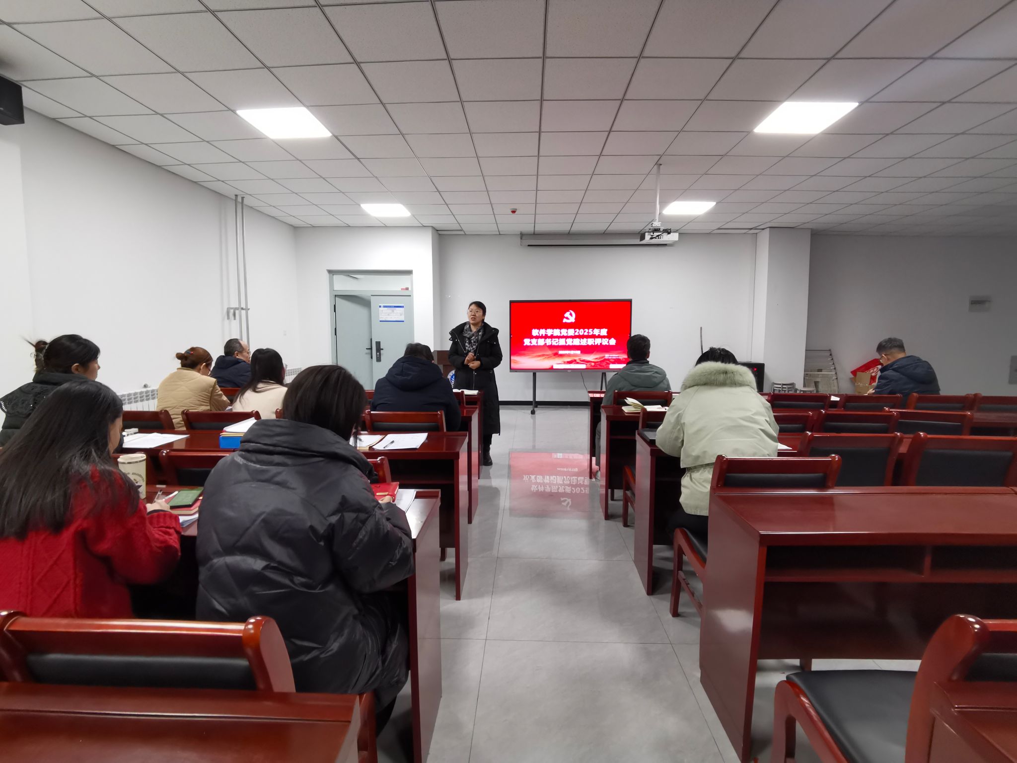 党委在软件实验大楼328会议室召开2025年度党支部书记抓党建工作述职评议会。学院党委委员、各党支部书记、党外人士代表及党员群众代表参加会议,会议由常旭青同志主持。
