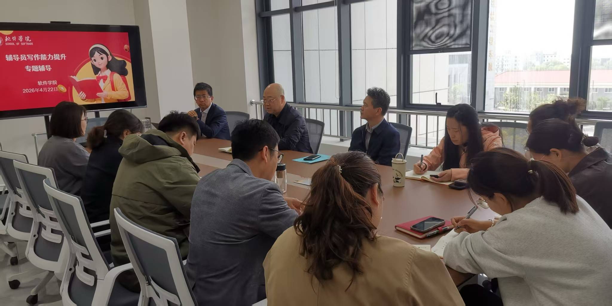辅导员写作能力提升专项辅导讲座在“追风逐梦”辅导员工作室举行。学院党委书记原彦飞出席讲座并发表讲话,院长强彦教授担任主讲人,党委副书记高宏图与全体辅导员参加了本次讲座。